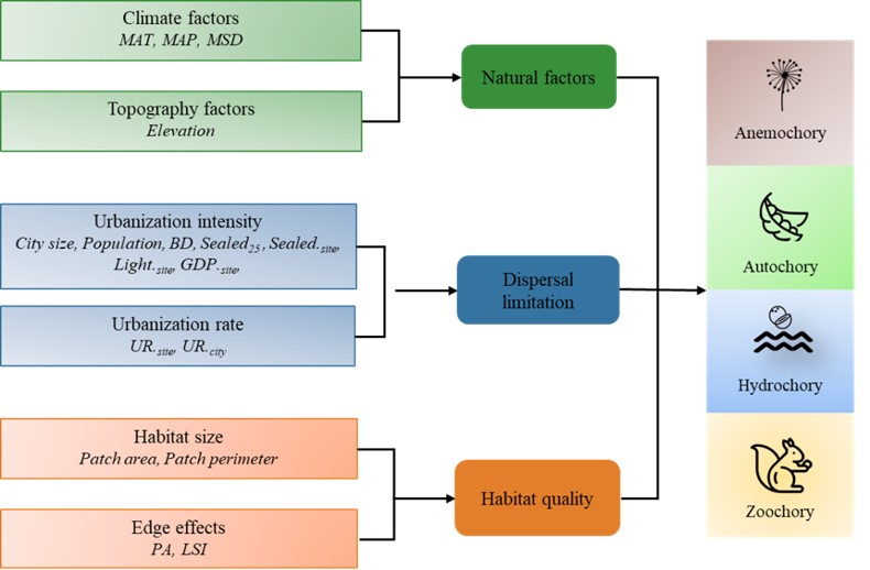 近日,我校农学与生命科学学院夏体渊研究员团队与华东师范大学生态与环境科学学院达良俊与宋坤研究团队,在Nature Cities上发表了题为“Response and sensitivity of urban plants with different seed dispersal modes”的研究论文,揭示了不同种子传播方式的自生植物的物种丰富度的影响因素及其敏感性差异,为阐明城市植物多样性维持机制提供了新的理解。华东师范大学宋坤(副教授)为论文的通讯作者,华东师范大学高志文(博士后)为论文的第一作者,中科院东北地理与农业生态研究所研究员潘应骥为论文共同一作,合作作者单位包括:西安建筑科技大学、东北林业大学、昆明学院、新西兰Nelson Marlborough Institute of Technology。