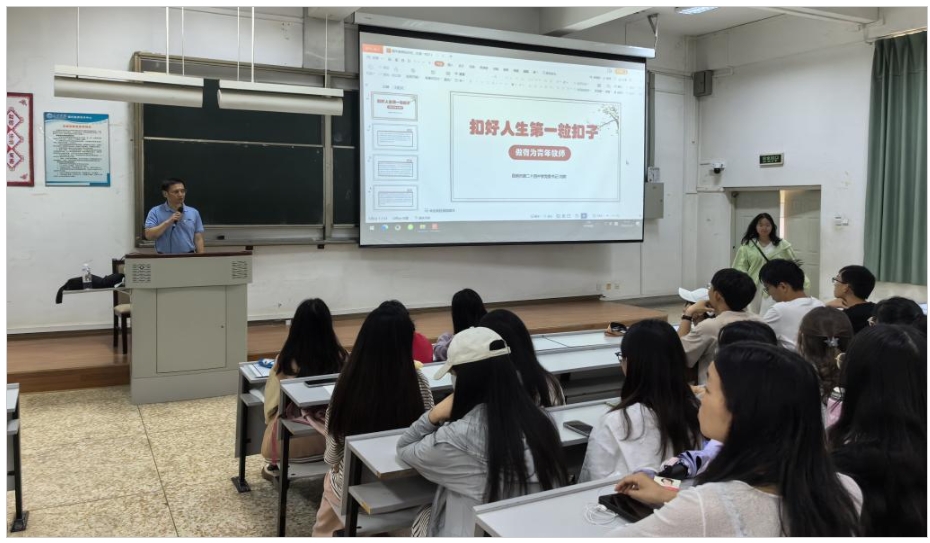 在讲座中,刘宾老师结合自身丰富的教育经验和深刻的人生洞察,为在场的师范生们提供了宝贵的指导和建议。他强调,作为青年教师,首要的任务是确立正确的教育目标和教育理念,这将对教师的整个职业生涯产生深远的影响。刘老师提到,“扣好人生第一粒扣子”意味着在教师生涯的初期就打下坚实的基础,包括专业知识的积累、教学技能的磨练以及对学生心理的理解。他鼓励学生们积极参与教学实践,通过不断的学习和反思,提升自己的教育教学能力。