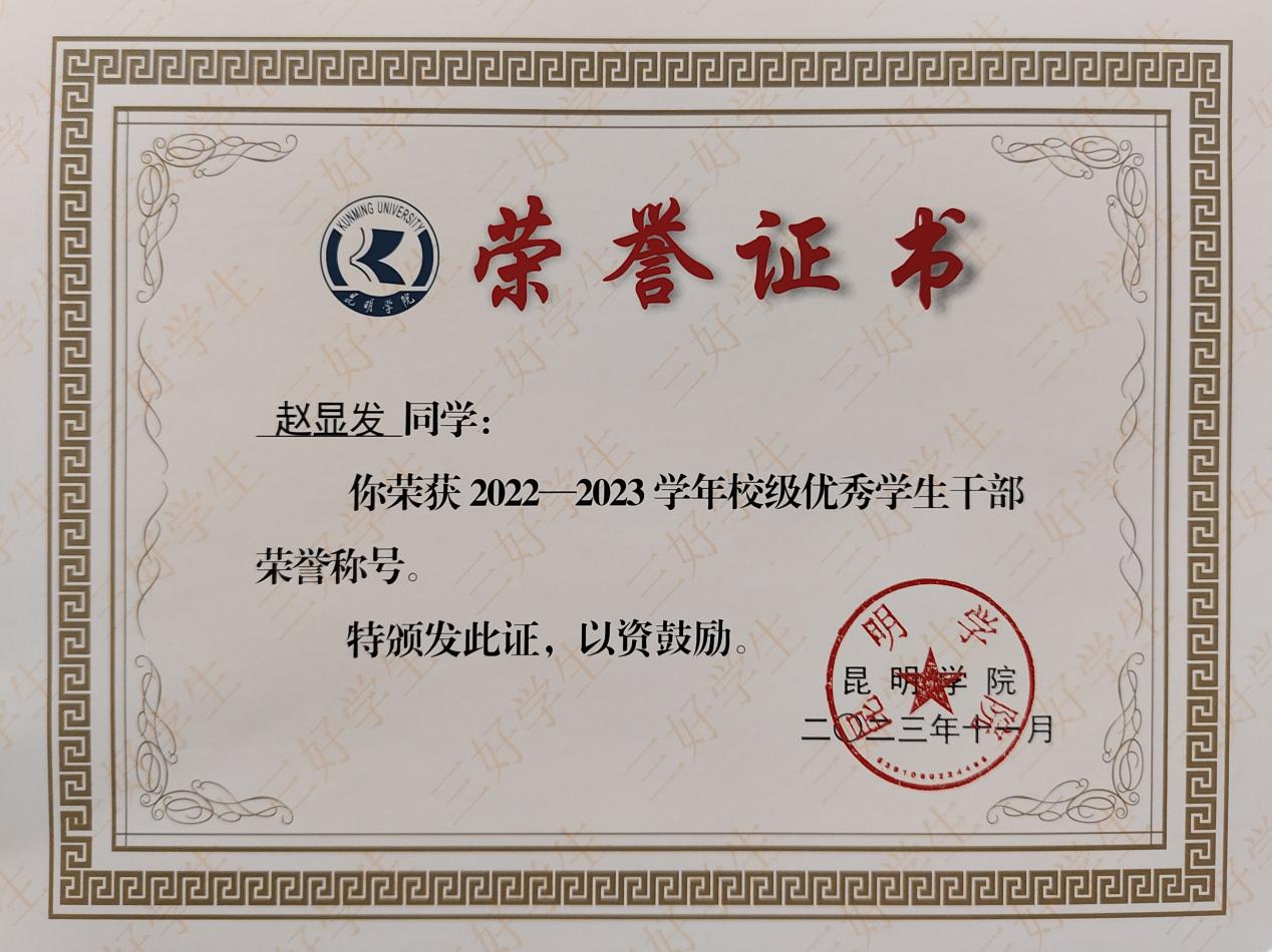 复学期间,赵显发荣获校级“优秀学生干部”、优秀教官、优秀志愿者等荣誉,“学创杯”大学生创新创业校级优秀奖,2024年4月荣获昆明学院“青春之星”称号。