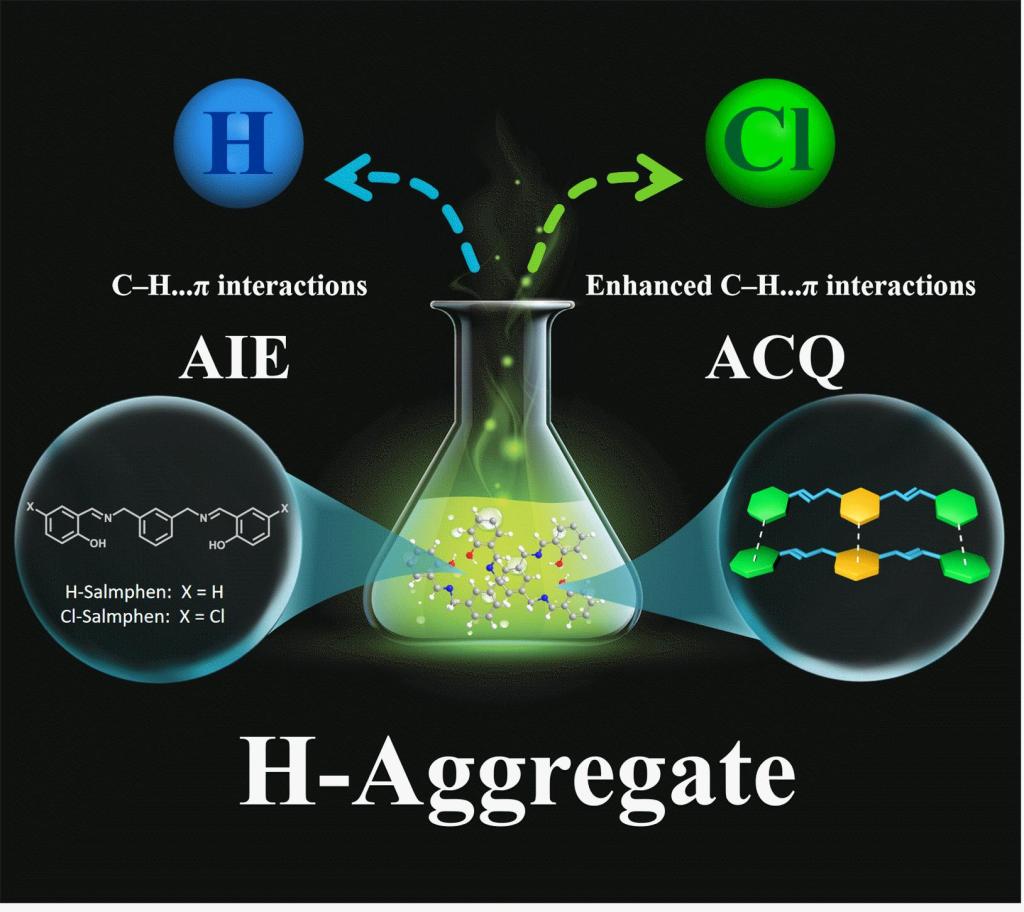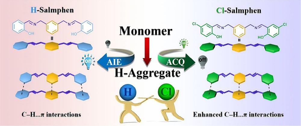 在最近的研究中,昆明学院吴琼教授团队,成功合成了两种具有H-聚集特性的席夫碱化合物Cl-Salmphen和H-Salmphen。单晶结构分析表明,两个光谱学呈H-聚集体特征的分子之间并不存在π-π相互作用;相反,相邻分子之间主要通过C-H...π相互作用连接。这意味着C-H...π相互作用也可以诱导H-聚集体的产生。更有趣的是,尽管卤素原子的引入并没有改变分子间的相互作用类型和堆积模式,但其荧光行为发生了从聚集诱导荧光增强(AIE)到聚集荧光猝灭(ACQ)的转变根本转变,理论计算表明这与卤原子的引入增强了分子间相互作用有关(图1)。性质研究表明,这种独特的相互作用模式在形成了超高光学信噪比的同时还有效的拓展了探针在有机物中水含量检测范围。此外团队利用这一特点,制作了一个高效的荧光试纸传感器,并借助手机实现了有机溶剂中含水量的快速、准确的实时检测。这项工作为H-聚集体的形成机制和新型光学器件的拓展提供了一个崭新的视角。