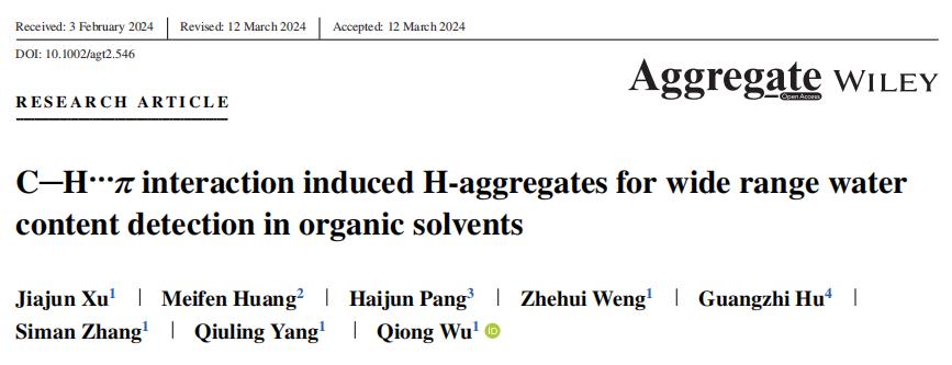 近日,我校化学化工学院吴琼教授团队在光学材料领域取得新进展,相关工作以题为“C-H...π interaction induced H-aggregates for wide range water content detection in organic solvents”的文章发表在顶级期刊《Aggregate》(doi.org/10.1002/agt2.546)上(中科院一区,影响因子: 18.8),实现了我校在国产顶级学术期刊的突破。我校化学化工学院2021级研究生许家俊为第一作者,化学化工学院吴琼教授为通讯作者。
