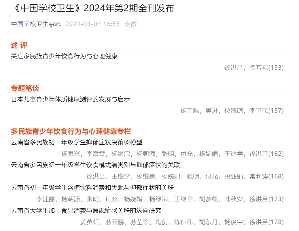近日,昆明学院医学院社区护理研究团队在北大核心期刊《中国学校卫生》上发表了五篇关于多民族青少年饮食行为与心理健康的论文,其中四篇为论著,一篇为述评。团队负责人徐洪吕博士受邀组稿本期重点号“多民族青少年饮食行为与心理健康”专栏并撰写述评,其余四篇论文由徐洪吕、杨家兴、李江丽和姜英虹四位老师分别作为第一作者发表。