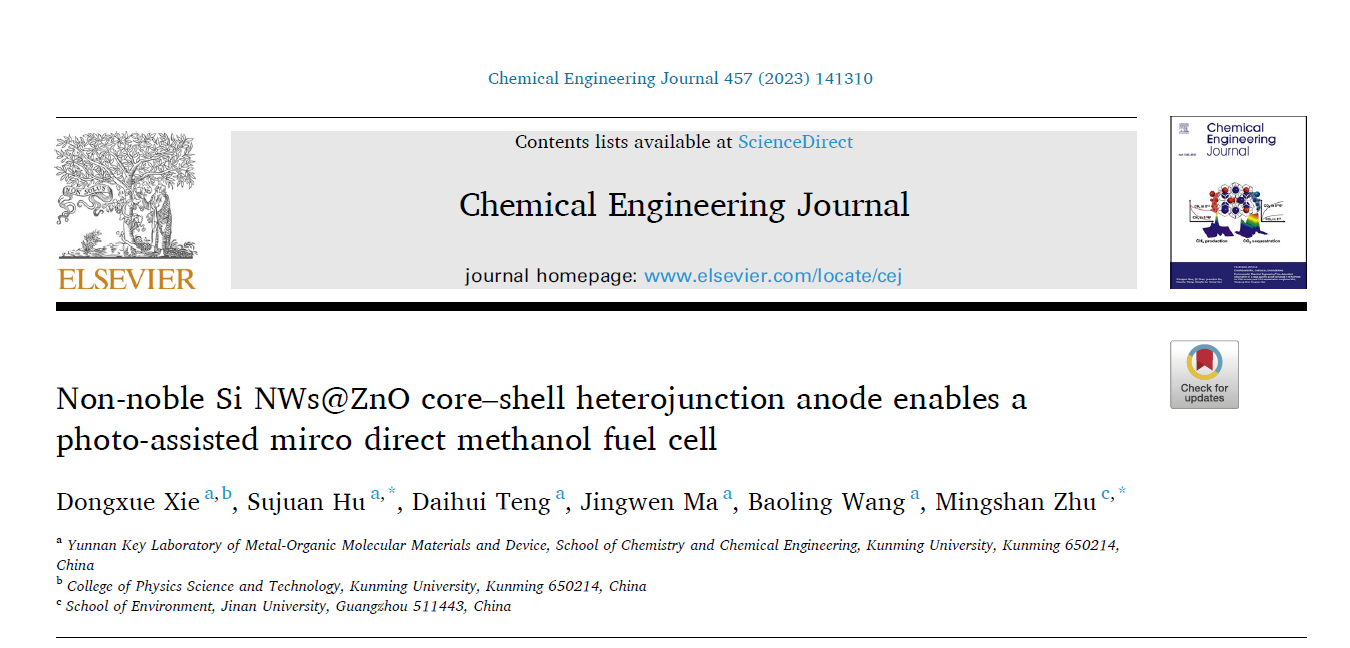 近日,我校胡素娟副教授课题组在工程技术与化学化工领域最有影响力的三大顶级刊物之一《Chemical Engineering Journal》(影响因子: 16.744)上发表了题为“Non-noble Si NWs@ZnO core–shell heterojunction anode enables a photo-assisted mirco direct methanol fuel cell”的研究论文。该文以昆明学院为第一单位,2019级硕士研究生谢冬雪为第一作者,暨南大学朱明山教授为共同通讯作者。该工作获得了国家自然科学基金-青年基金和地区基金、云南省地方本科高校基础研究联合专项-重点项目、云南省化学化工学院云南省高校科技创新团队的资金支持。