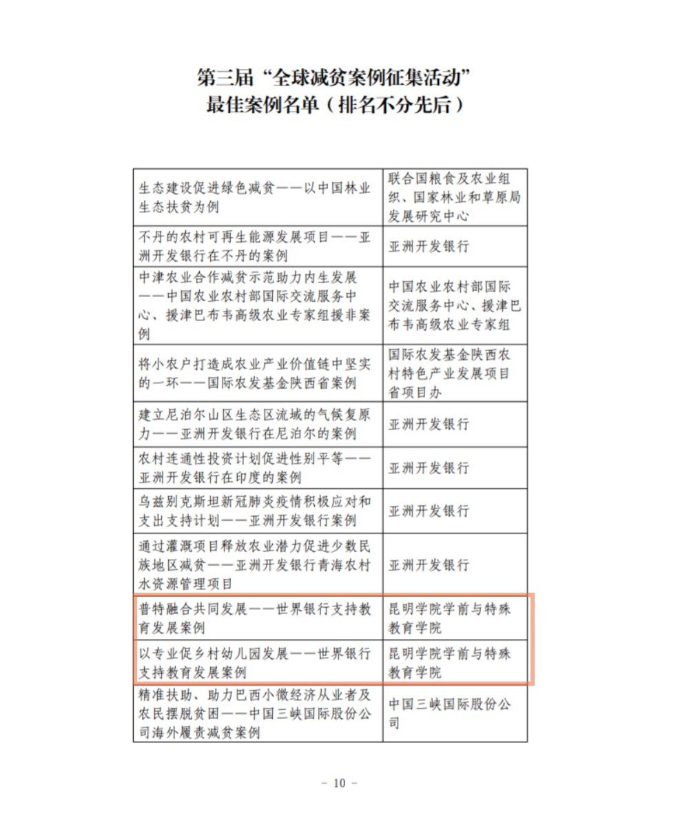 近日,由中国国际扶贫中心、国际农业发展基金、联合国粮食及农业组织、联合国世界粮食计划署和中国互联网新闻中心主办的“2022全球减贫伙伴研讨会”召开,会议发布了“第三届全球减贫案例征集活动”获奖案例。此次征集活动共收到减贫案例517个,获奖104个,云南省入选获奖案例3个。我校学前与特殊教育学院申报的两个案例《普特融合共同发展--世界银行支持教育发展案例》、《以专业促乡村幼儿园发展--世界银行支持教育发展案例》获评为最佳案例。