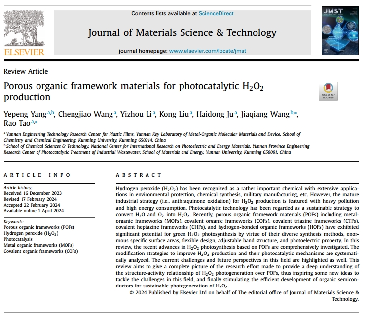 近日,昆明学院化学化工学院、云南省金属有机分子材料与器件重点实验室杨烨鹏与陶娆团队在材料领域权威期刊Journal of Materials Science & Technology(中科院一区,影响因子10.9)上发表文章Porous organic framework materials for photocatalytic H2O2 production(DOI:10.1016/j.jmst.2024.02.062)。昆明学院为第一完成单位,青年教师杨烨鹏博士为第一作者,23级硕士研究生王成娇为第二作者,陶娆博士、云南大学王家强教授为共同通迅作者。